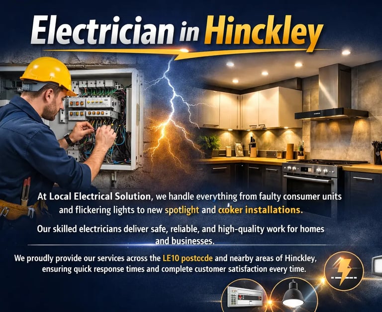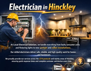 At Local Electrical Solution Hinckley team, we handle everything from faulty consumer units and flickering lights to new spotlights and cooker installations. Our skilled electricians deliver safe, reliable, and high-quality work for homes and businesses. Local Electrical Solution Hinckley team proudly provides our services across the LE10 postcode and nearby areas of Hinckley, ensuring quick response times and complete customer satisfaction every time.